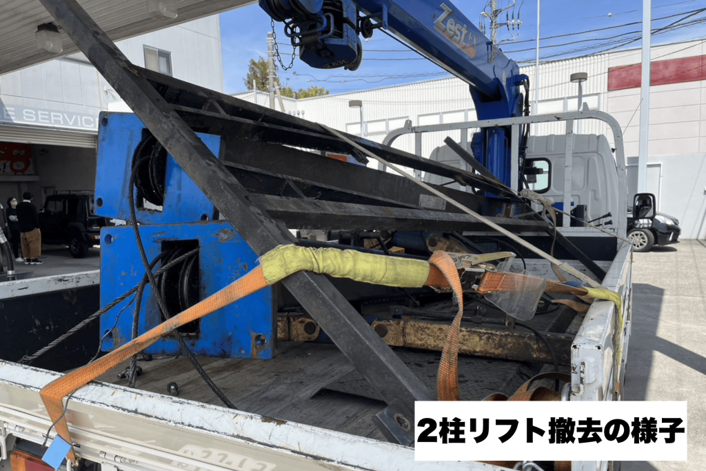 老朽化した2柱リフト2台を同日撤去。開口部養生・アンカーボルト処理・原状確認まで当社で対応し、30万円で買取成立。搬出費は無料です。